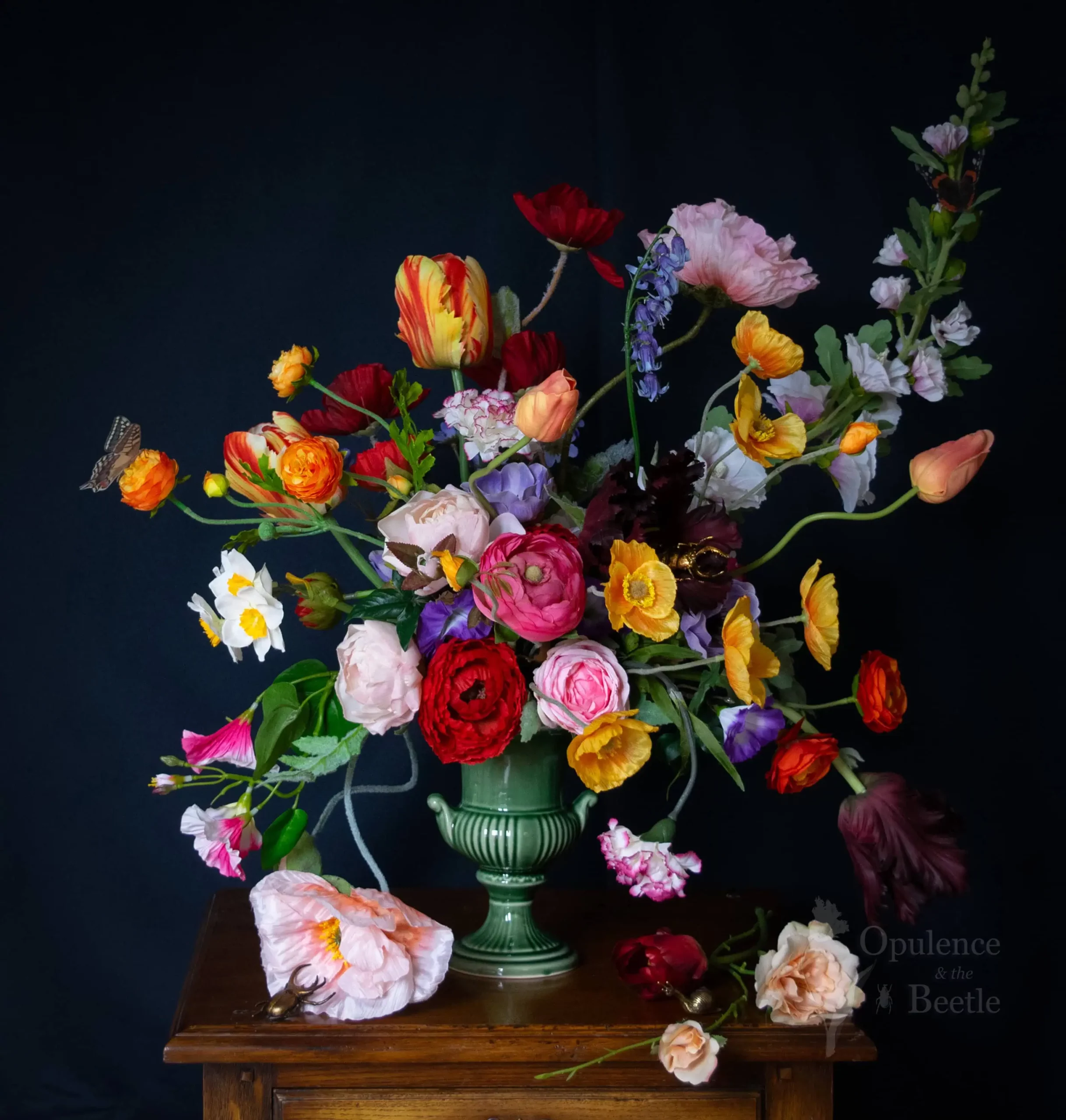 I began with the still life paintings of the Dutch Masters, creating with faux flowers designs inspired by their compositions which in reality never existed! I loved it. Soon I was branching out into less formal designs, especially bespoke arrangements for private clients, businesses and historic houses. I also exhibit at shows and fairs as my business grows and will soon be appearing in exhibitions. The future of faux flowers is an exciting one full of possibilities and I look forward to The Beetle finding new ways to meet them.