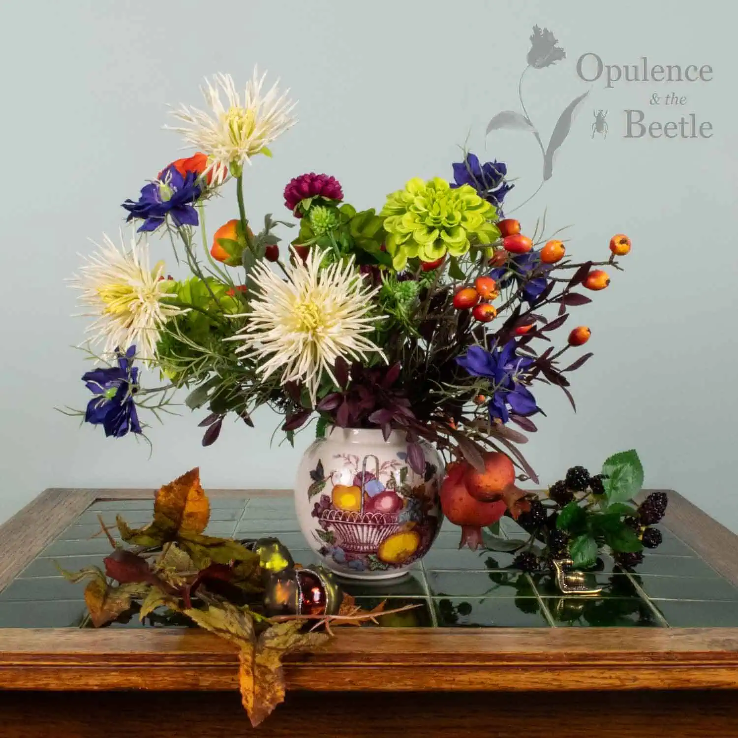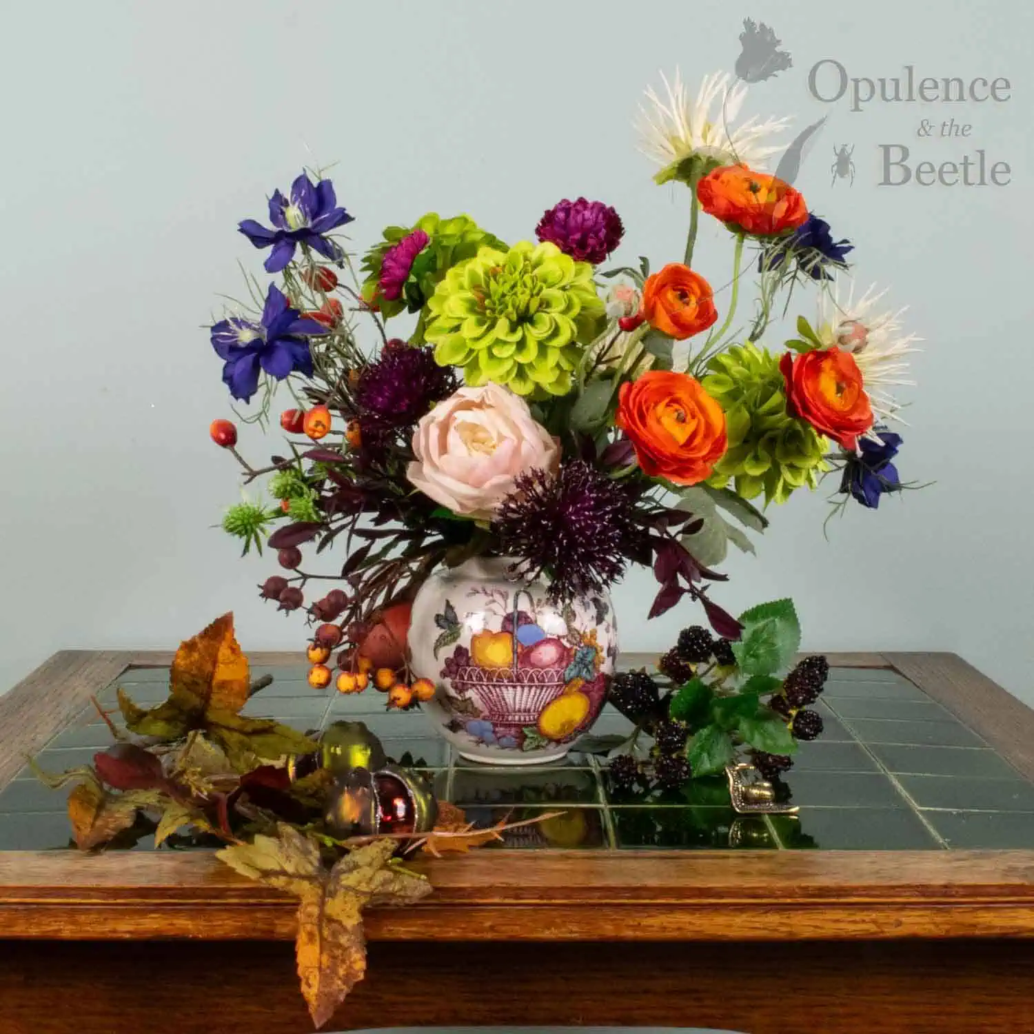 Standing at roughly 38cm tall and 40cm wide, this smaller centrepiece incorporates zinnias, chrysanthemums, nigella (‘Love in the Mist’), fireball lilies, ranunculus, eryngiums (‘Sea Holly’), berries, rosehips and a delightful pair of pomegranates – all in addition to the eponymous Last Rose of Summer. The vintage Mason vase is in excellent condition, with minor crackle to the glaze only adding to its charm.