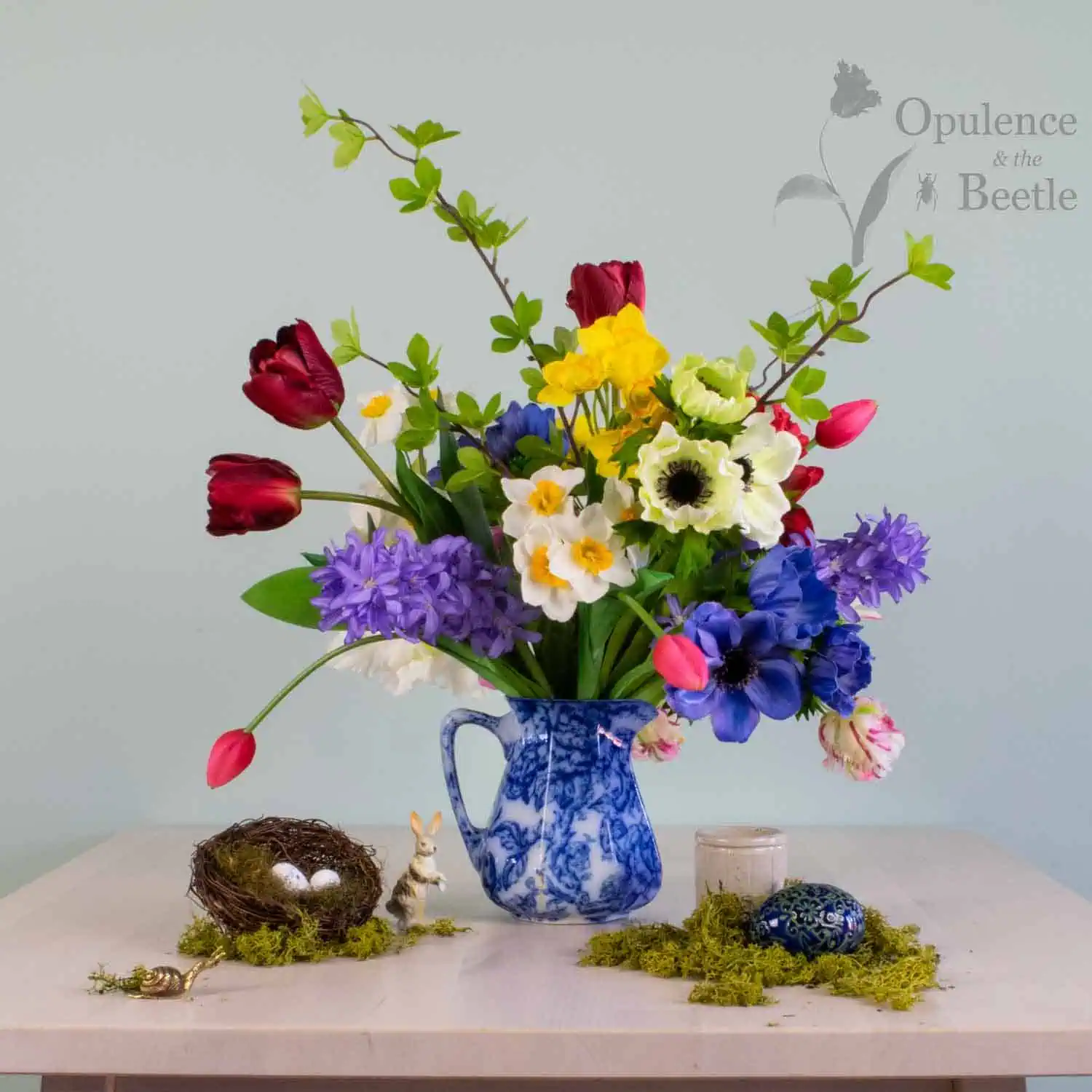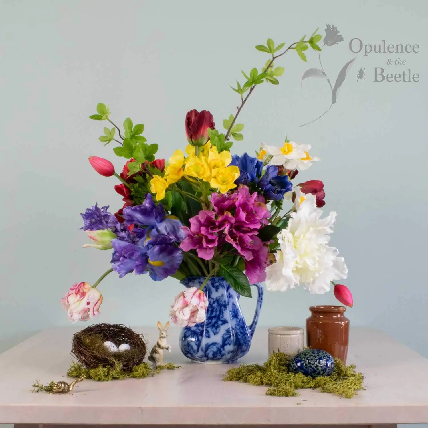 This joyful centrepiece celebrates the riot of colour which announces the arrival of Spring and stands at approximately 55cm tall and 48cm wide.  Embracing unashamedly clashing colours just as nature does, a selection of blushing tulips and rhododendron in pinks and red are combined with the indigos, yellows and creams of narcissi, irises, hyacinths and anemones in a beautiful vintage (potentially even antique) Losol Ware jug. The jug itself, decorated in the timeless Flow Blue Cavendish pattern, is in excellent condition, with only the smallest scratches to the glaze around the rim.