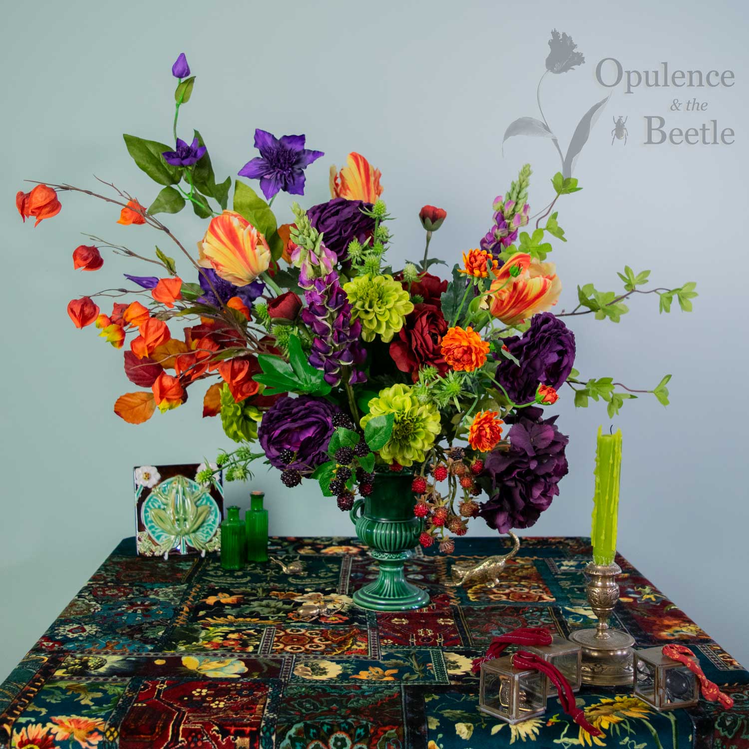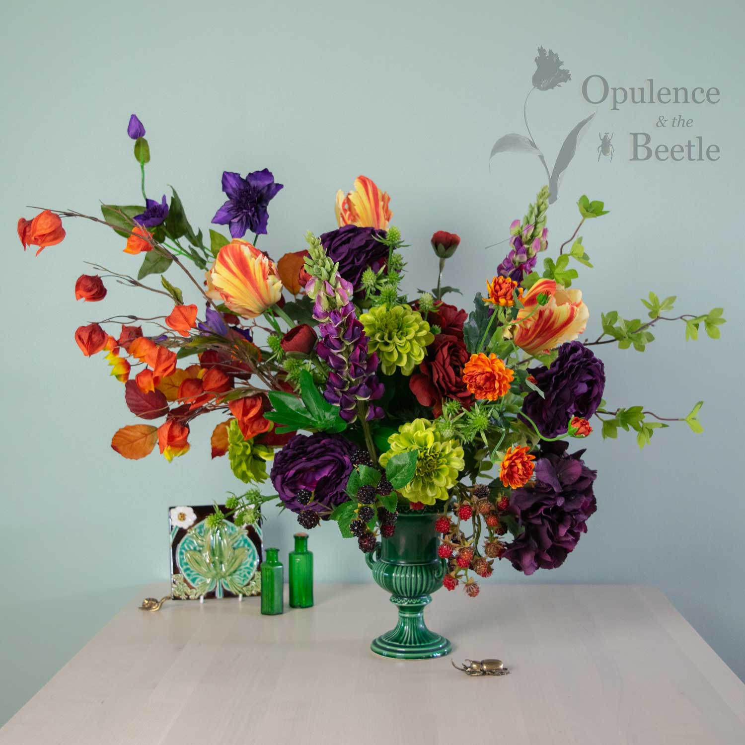 I love unusual combinations. For this arrangement I wanted to create something a little gothic and so I intermixed deep aubergine ranunculus (which looks almost poisonous) with the fabulous parrot tulips whose fiery yellow and amber streaks seem to resemble a warning of danger. Combined with thorny blackberries and sea holly, plus lime green (toxic?) zinnias, and the effect is really quite dramatic! Physalis, clematis and a pair of stunning lupins bring height to the arrangement, whilst copper beech leaves and a handful of tiny chrysanthemums bring light and softness amongst the deeper russet ranunculus and purple hydrangea. Holding the arrangement is a beautiful vintage Dartmouth Pottery vase in majolica green which is in excellent condition. This creation is designed to be enjoyed on a mantelpiece or mid-sized shelf and is certainly not for the faint hearted.